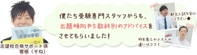 都立入試にどんな問題が出るのか分からなくて、少し心配だったけど、今日講座に参加して分かったので本当に良かったです。過去の問題集を買ったので、それを使って頑張りたいと思いました。