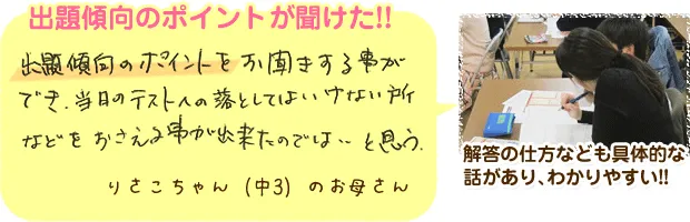 出題傾向のポイントをお聞きする事ができ、当日のテストへの落としてはいけない所などをおさえる事が出来たのでは…と思う。