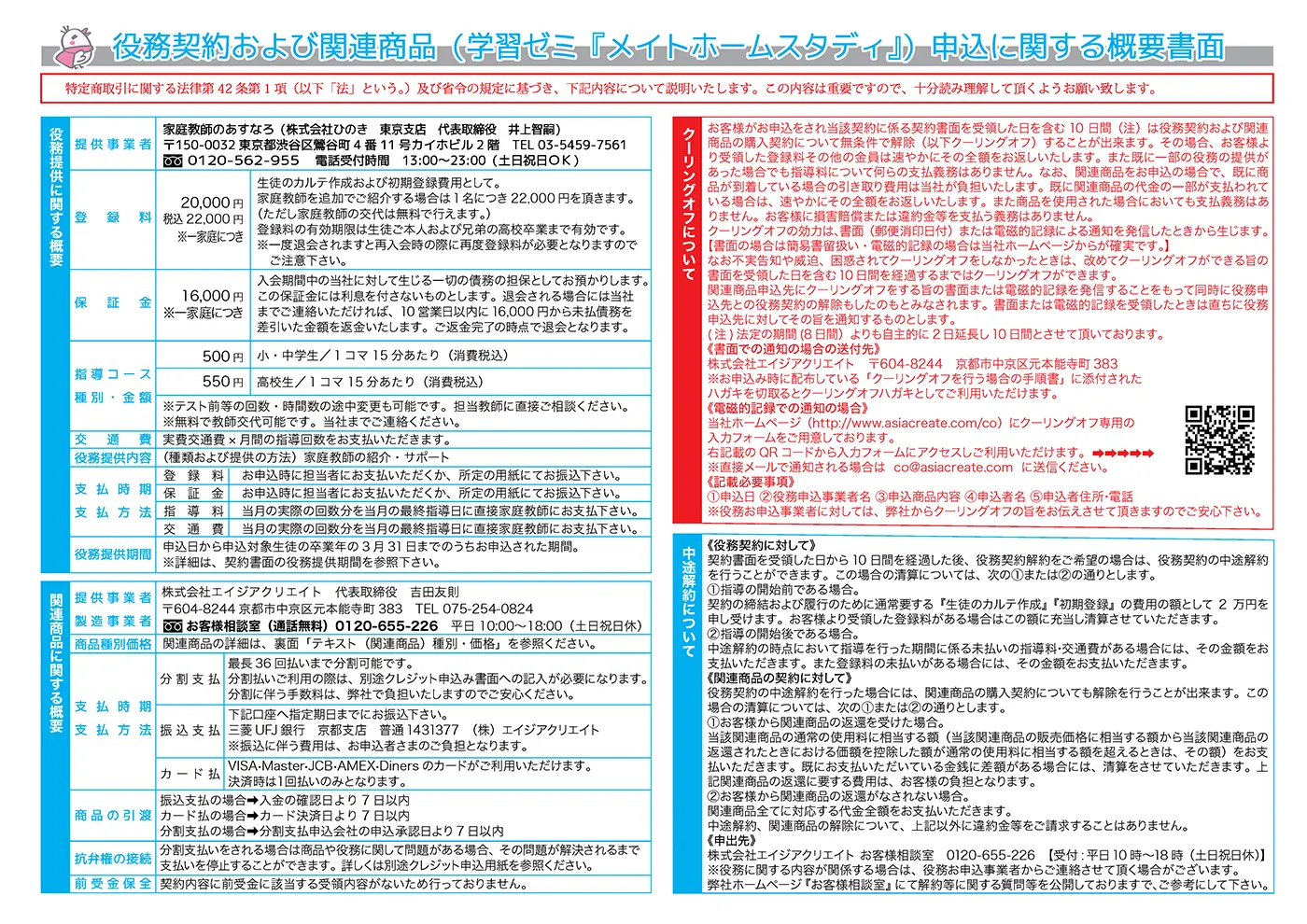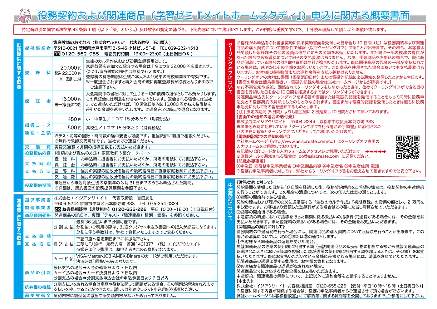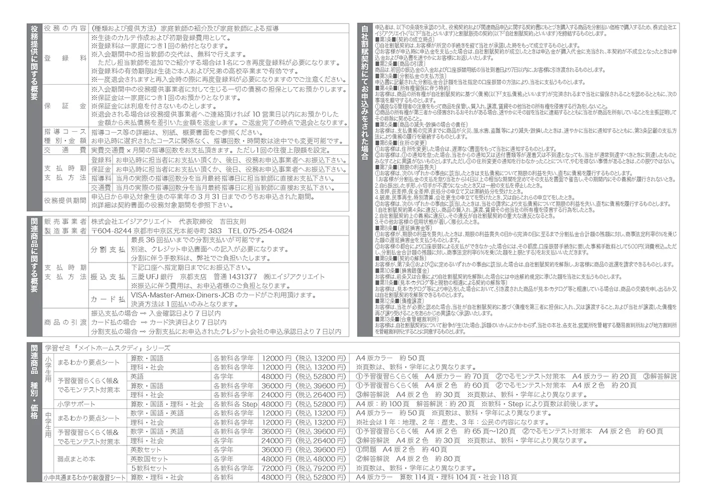 家庭教師と学習ゼミを使った指導法の概要書面・申込書面