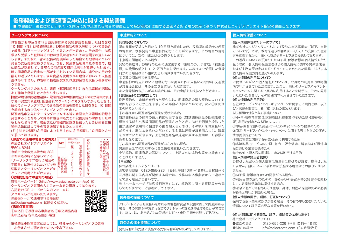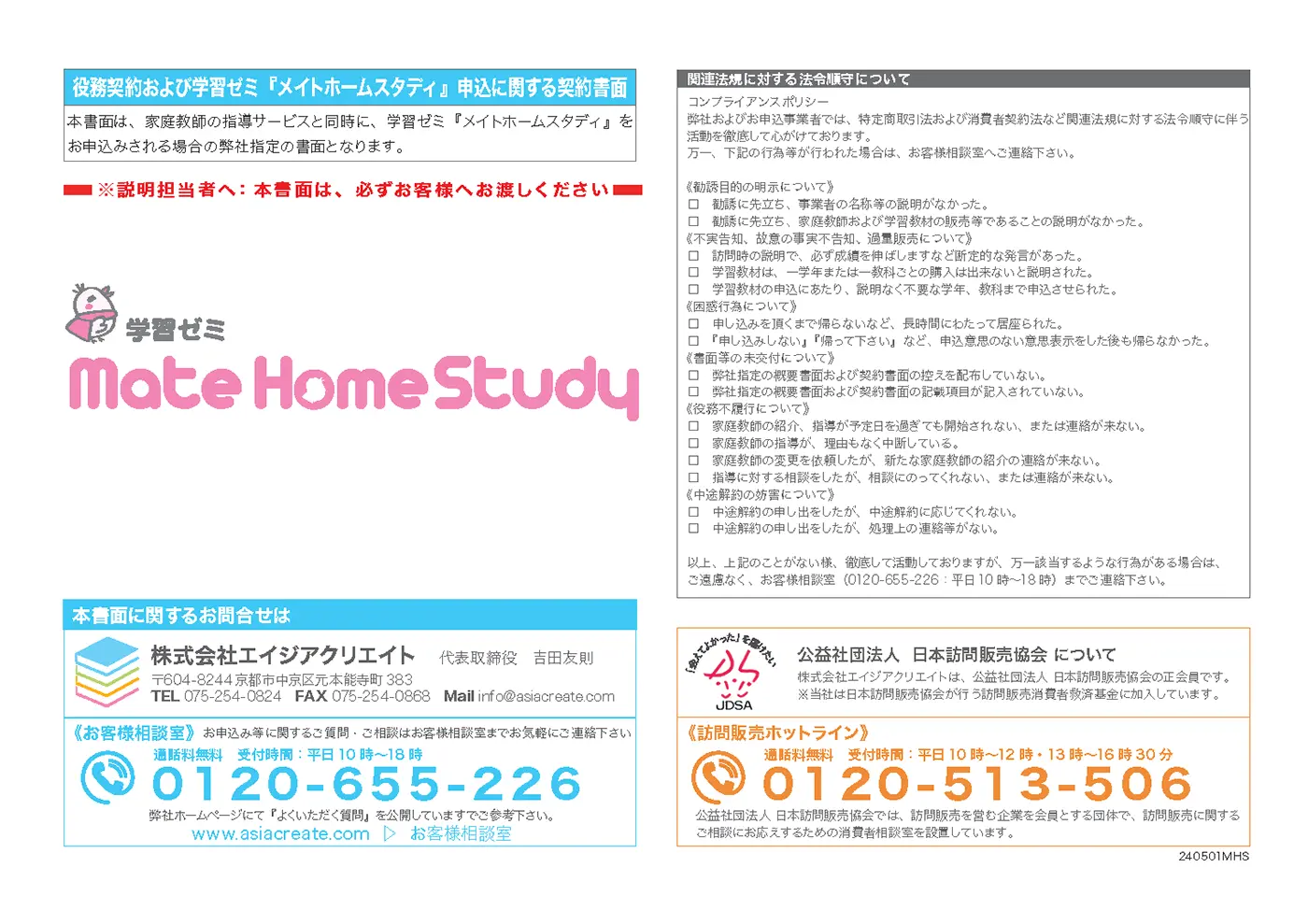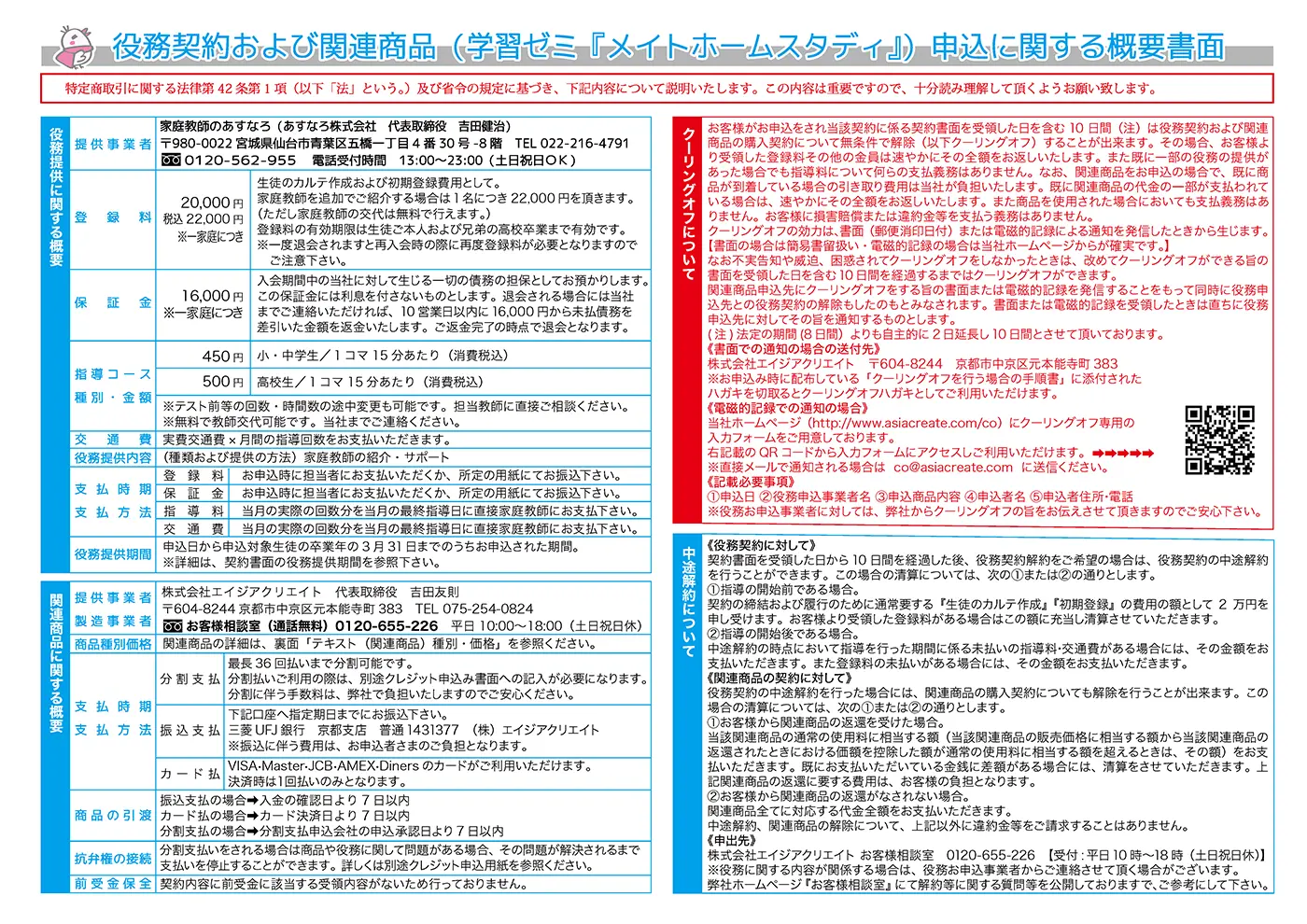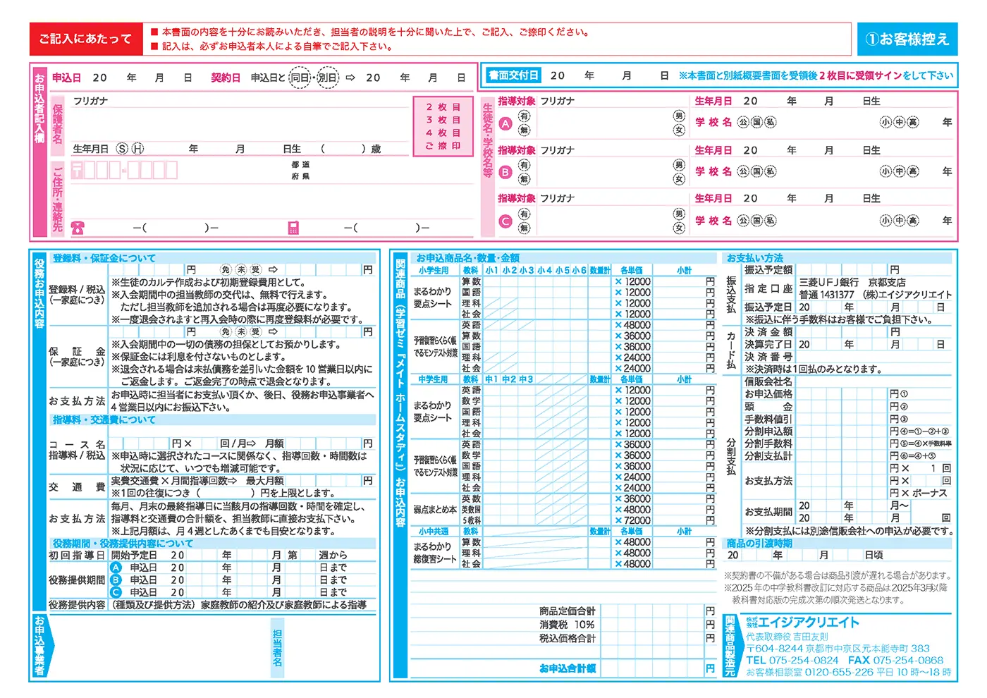 家庭教師と学習ゼミを使った指導法の概要書面・申込書面