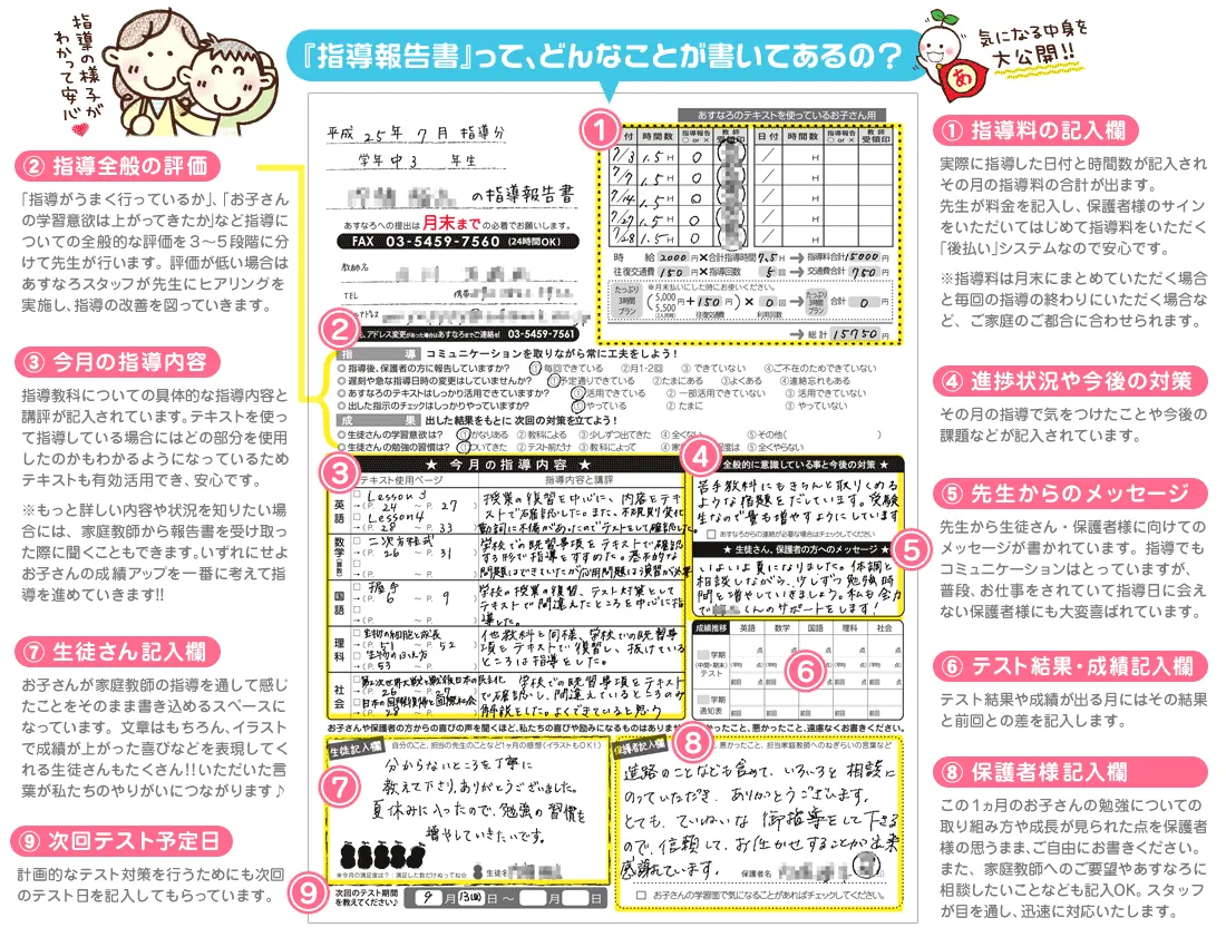【指導報告書】には授業中の様子や教科ごとの指導内容、反省点や今後の対策などを担当家庭教師が細かく書いて毎月保護者の方にお渡ししています。