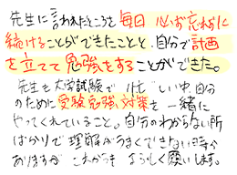 先生に言われたところを毎日必ず忘れずに続けることができたことと、自分で計画を立てて勉強することができた。先生も大学試験で忙しい中、自分のために受験勉強対策を一緒にやってくれていること。自分のわからない所ばかりで理解がうまくできない時がありますが、これからもよろしくお願いします。