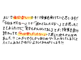 まじで毎回楽しいです!授業を受けていて思います!!「今日はやだな~」とか「疲れてるんだよな~」とか思ったこともあったけど「先生もがんばってるし!」とか、授業を受け終わっても「やっぱ楽しかったな~」って思えて次もがんばれました!!これからも少しずつ自分のペースになってしまうこともたくさんあるんですけど、よろしくお願いします!!