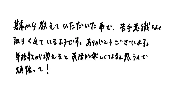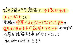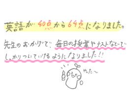 英語が40点から64点になりました。 先生のおかげで、毎日の授業やテストなどでしっかりついていけるようになりました!!
