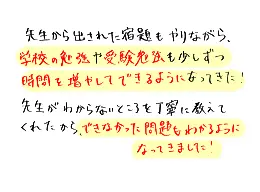 先生から出された宿題もやりながら、 学校の勉強や受験勉強も少しずつ時間を増やしてできるようになってきた! 先生がわからないところを丁寧に教えてくれたから、 できなかった問題もわかるようになってきました!