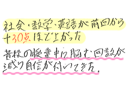 社会・数学・英語が前回から+30点ほど上がった 普段の授業中に悩む回数が減り自信が付いてきた。
