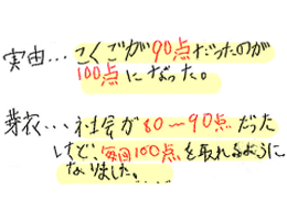 実由・・・こくごが90点だったのが100点になった。 芽衣・・・社会が80~90点だったけど、毎回100点取れるようになりました。
