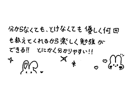 分からなくても、解けなくでも優しく何回も教えてくれるから楽しく勉強ができる!!とにかく分かりやすい!!