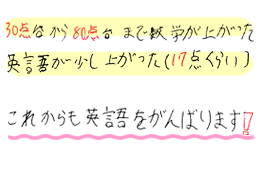 30点台から80点台まで数学が上がった。英語が少し上がった。(17点ぐらい) これからも英語がんばります!