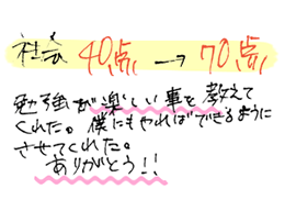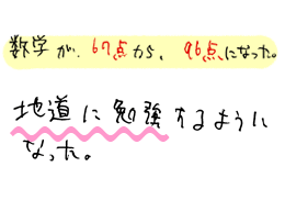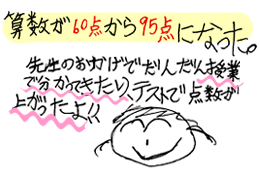 算数が60点から95点になった。先生のおかげでだんだん授業で分かってきたり、テストで点数が上がったよ!!
