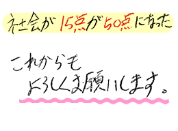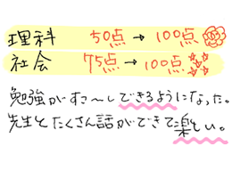 理科50点→100点 社会75点→100点 勉強がすこ?しできるようになった。先生とたくさん話ができて楽しい。