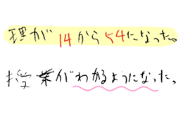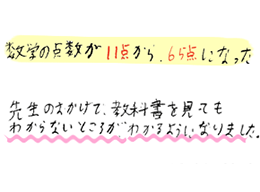 数学の点数が11点から65点になった。先生のおかげで教科書を見ても分からないところが、分かるようになりました。