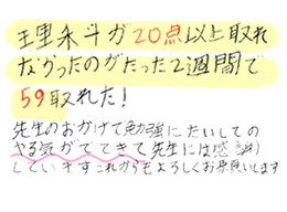 理科が20点以上取れなかったのがたった2週間で59取れた!先生のおかげで勉強に対してのやる気が出てきて先生には感謝しています。これからもよろしくお願いします。