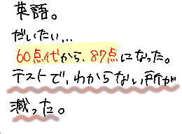 英語。だいたい60点台から87点になった。テストで、わからない所が減った。