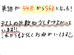 英語が34点から56点になった!テストの点数が少しずつ上がっています!!これからもよろしくおねがいします(^^)