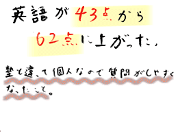 英語が43点から62点に上がった。塾と違って個人なので質問がしやすくなったこと。