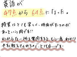 英語が47点から64点になった。授業はとても楽しく、時間がたつのがあっという間です!!わからない所を質問するともう一度、わかりやすく教えてくれるので、とても良いです!
