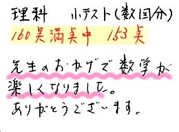 理科小テスト160点満点中153点。先生のおかげで数学が楽しくなりました。ありがとうございます。