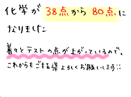化学が38点から80点になりました。着々とテストの点が上がっているので、これからもご指導よろしくお願いします!!
