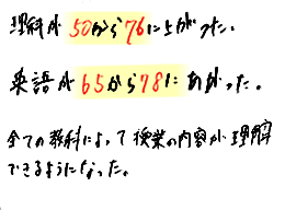理科が50から76に上がった。英語が65から78にあがった。全ての教科によって授業の内容が理解できるようになった。