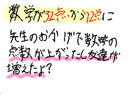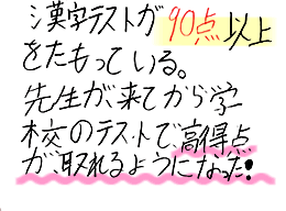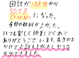 国語が10点位から30.5(50点満点中)になった。全部の教科が上がった。いつも楽しく授業してくれてありがとうございます。先生のおかげで点数も上がったし、やる気が出てきました。