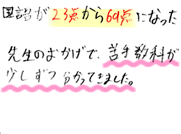 国語が23点から69点になった。先生のおかげで、苦手教科が少しずつわかってきました。