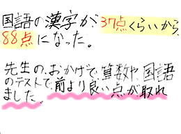 国語の漢字が、37点くらいから、88点になった。先生のおかげで、算数や国語のテストで、前より良い点が取れました。