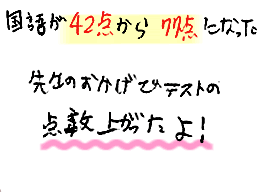 国語が42点から77点になった。先生のおかげでテストの点数上がったよ!