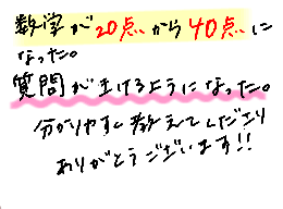 数学が20点から40点になった。質問がきけるようになった。分かりやすく教えてくださりありがとうございます!!