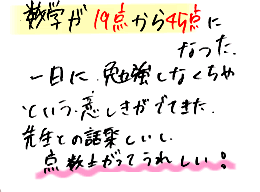 数学が19点から45点になった。一日に勉強しなくちゃという意しきがでてきた。先生との話楽しいし、点数上がってうれしい!