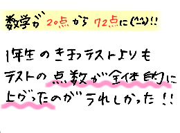数学が20点から72点に(^^)!!1年生のきまつテストよりもテストの点数が全体的に上がったのがうれしかった!!