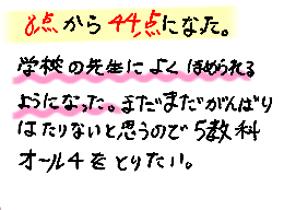 8点から44点になった。学校の先生によくほめられるようになった。まだまだがんばりはたりないと思うので5教科オール4をとりたい。