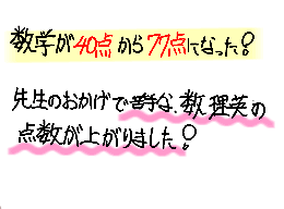 数学が40点から77点になった!先生のおかげで苦手な、数理英の点数が上がりました!
