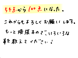 54点から100点になった。これからもよろしくお願いします。もっと頑張るので、いろいろな事を教えてください!