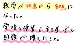 数学が50点から80点になった。学校の授業で手を挙げる回数が増えたこと。
