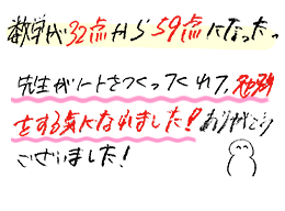 数学が32点から59点になった。先生がノートをつくってくれて、勉強をする気になれました!ありがとうござました!