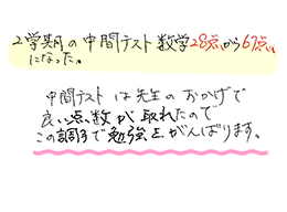 2学期の中間テスト数学28点から67点になった。中間テストは先生のおかげで良い点数が取れたのでこの調子で勉強をがんばります。