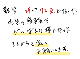 数学29点⇒72点になった。先生の宿題をがんばれる様になった。これからも宜しくお願いします。