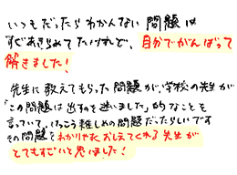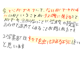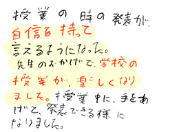 授業の時の発表が自信を持って言えるようになった。先生のおかげで学校の授業が楽しくなりました。授業中に手をあげて発表できる様になりました。