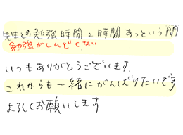 先生との勉強時間2時間があっという間。勉強がしんどくない。いつもありがとうございます。これからも一緒にがんばりたいです。よろしくお願いします。