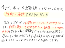 今まで、家で全然勉強しなかったけど、自主的に勉強するようになった。先生のおかげで成績がたくさん上がりました。また、数学の先生にもほめられたり、担任にもほめられたりしました。あと受験まで3カ月ですが、志望校に受かるようにがんばります。高校生になってもよければ教えて下さい。これからもよろしくお願いします。